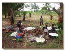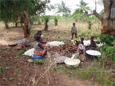 Kinder beim Maniokschälen nach der Ernte